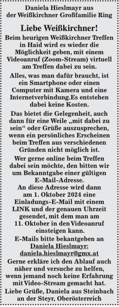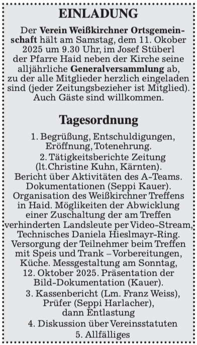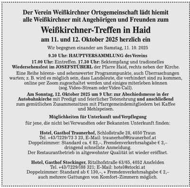 Dieses Jahr findet wieder das Weißkirchner Treffen im Pfarrstüberl gleich neben der Kirche vom 11-12. 10.2025 in Haid / Österreich